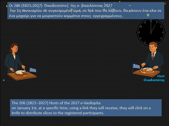We invite you and all Hellenism, from Greece, from Cyprus, the Greek diaspora, but also all philhellenes to register for free to get your "Fele" at the cutting of the global online (AR) e-vasilopita for 2027 which will take place here on the internet on January 1, 2027.