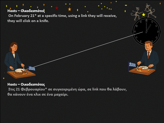 Κάθε Οικοδεσπότης θα κόψει(21-2-2026 σε συγκεκριμμένη ώρα) και θα μοιράσει κομμάτι της e-βασιλόπιτας σε έναν αριθμό εγγεγραμμένων που θα εξαρτηθεί απο το πλήθος των εγγραφών μέχρι τη στιγμή της κοπής. Στην κατωτέρω εικόνα μπορείτε να δείτε που θα εμφανίζονται οι 205(1821-2026) συνολικά Οικοδεσπότες.